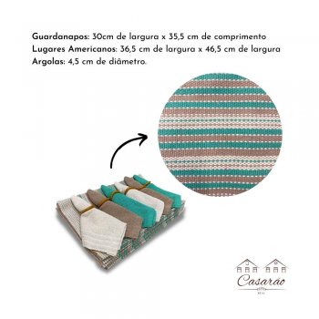 O Kit possui 06 argolas, 06 guardanapos e 06 lugares americanos.